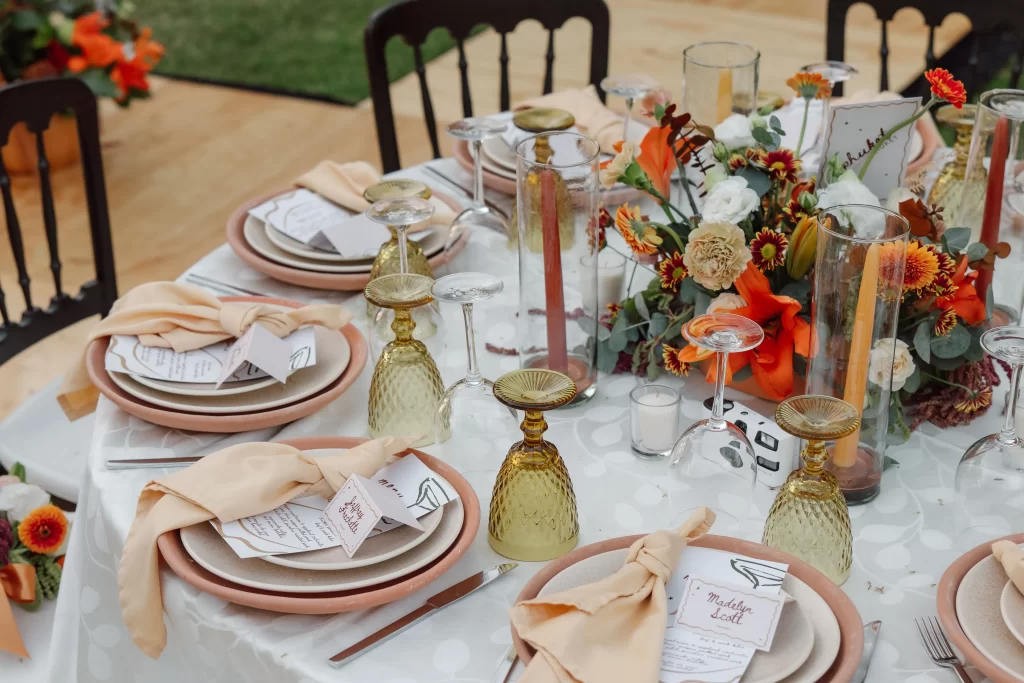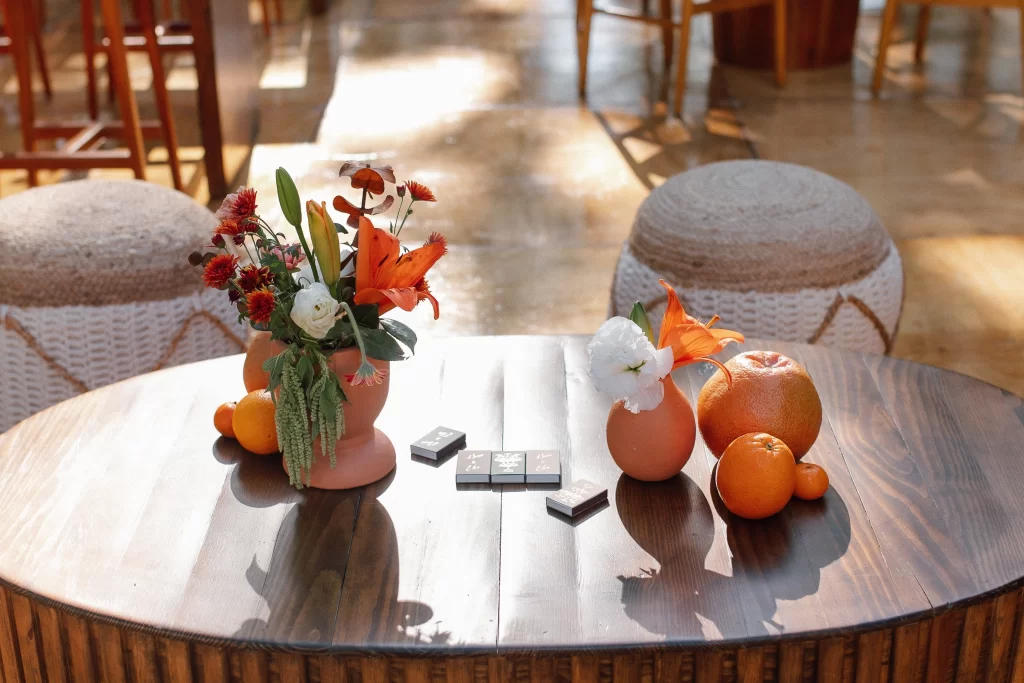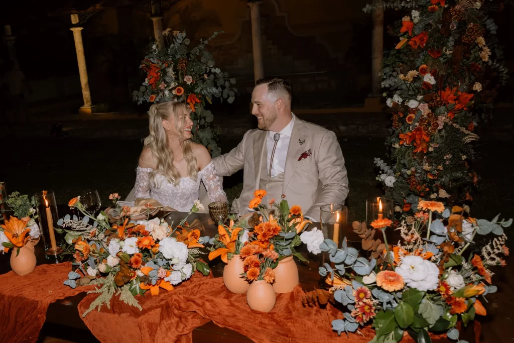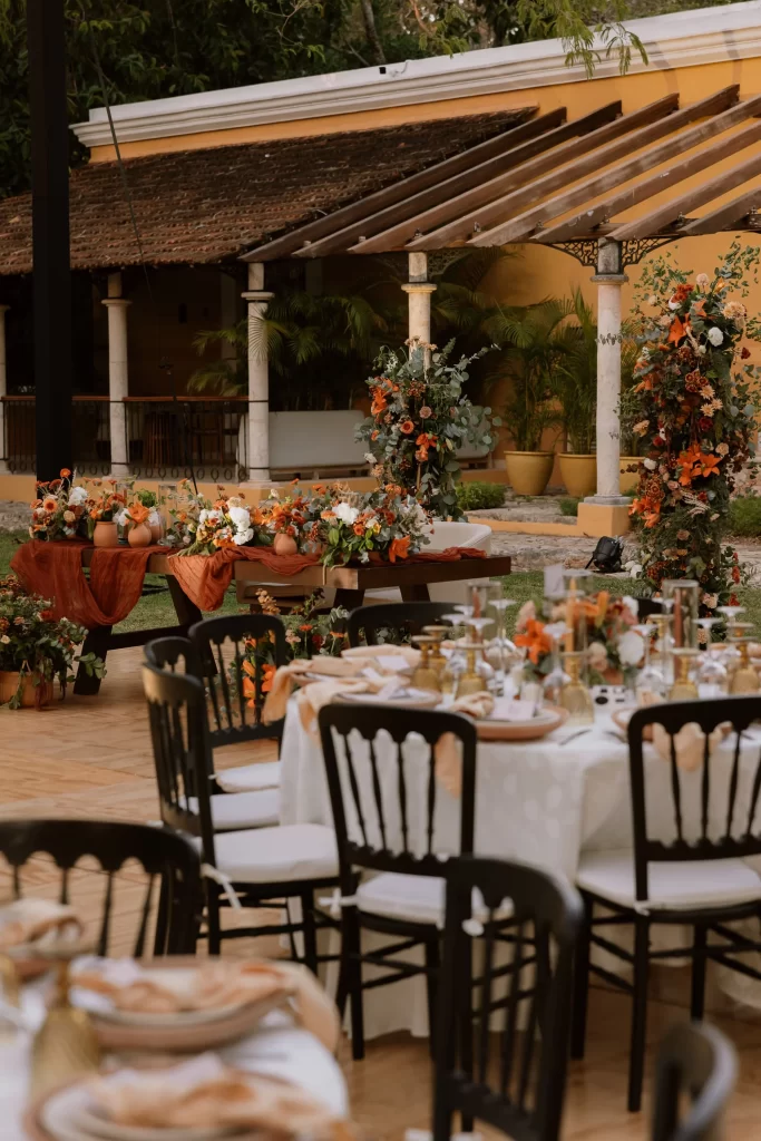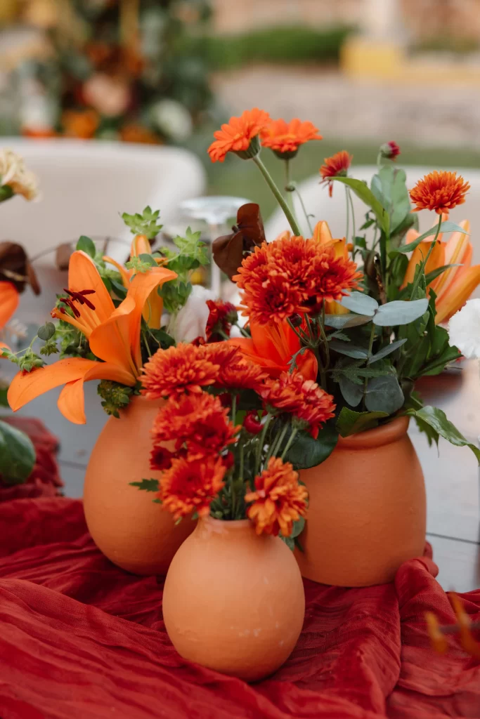 They embraced a palette inspired by fall deep reds, burnt oranges, soft greens, and golden mustard tones that came alive as the sun began to set. The florals felt fresh and natural: lilies, daisies, mini gerberas, and hints of amaranth arranged in rustic barro clay vessels. And the sweetest surprise? Tiny tangerines nestled between the blooms, a perfect nod to Yucatán’s citrus roots.