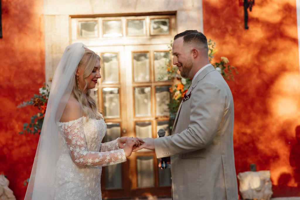 They planned their “I do” to end just before sunset. That one choice gave them portraits bathed in golden light and a seamless flow for their guests. As the sun dipped lower, everything shifted: the florals turned to honey, the barro grew richer, and the hacienda walls glowed deep.