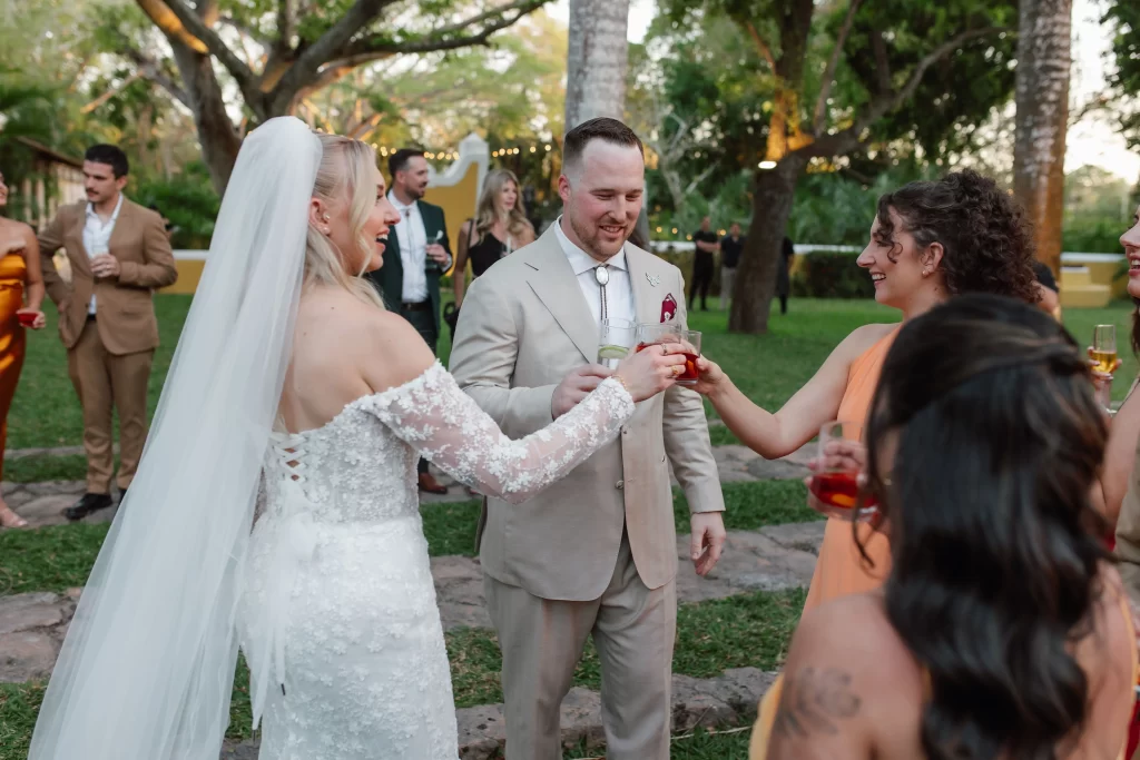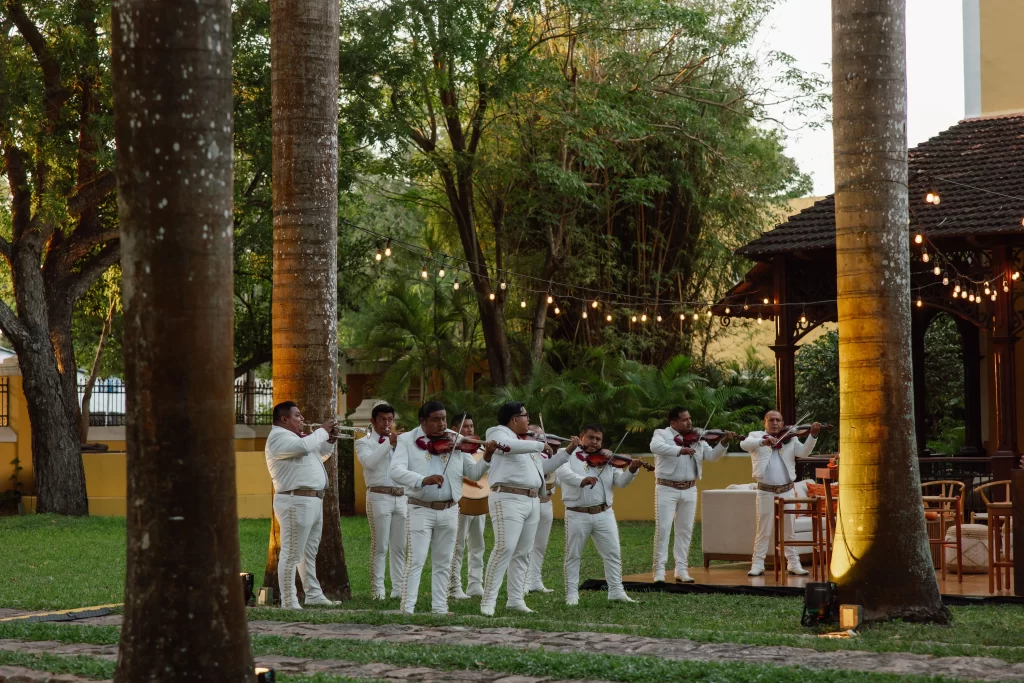 While Elise & Beau slipped away for photos, the Hacienda Xcanatun´s courtyard came alive. The first notes of mariachi filled the air as guests, many visiting from the U.S. gathered under the fading light. Trays of Yucatecan bites and glasses of mezcal moved through the crowd, mixing laughter with the scent of lime and spice. In that moment, music, flavor, and place danced together, capturing the soul of the celebration.