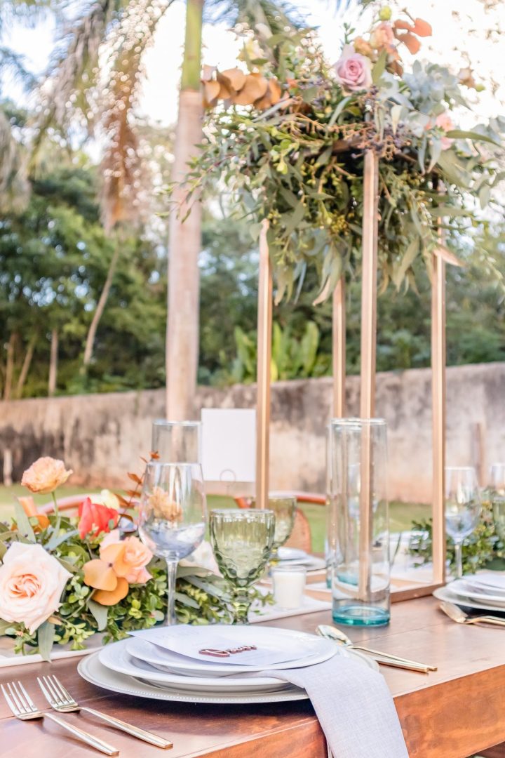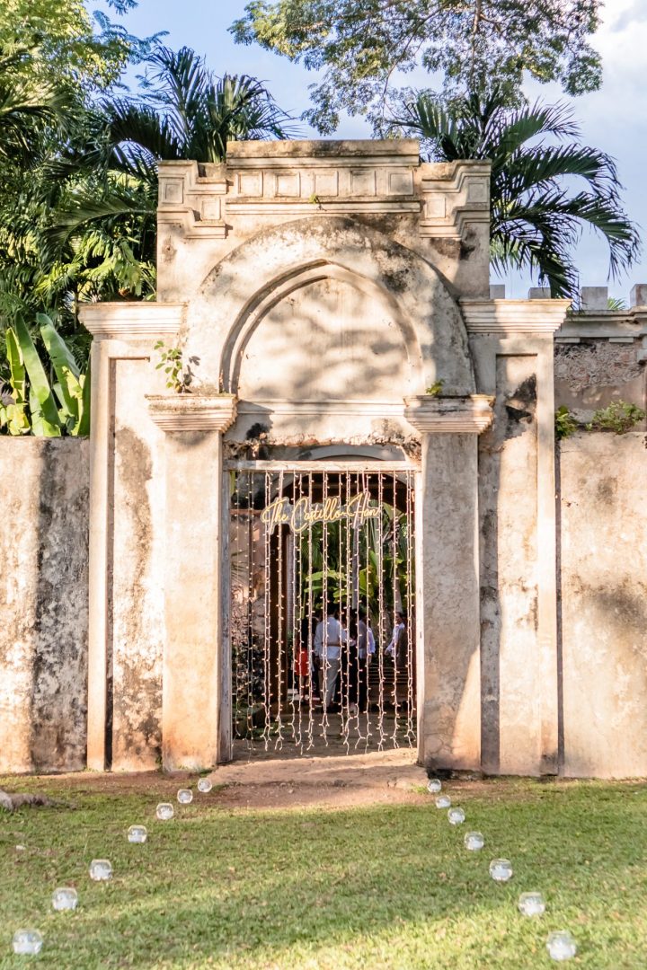 The main garden of the Hacienda welcomed the guests at sunset. The bride and groom chose an Ethereal Heir style with touches of their own.