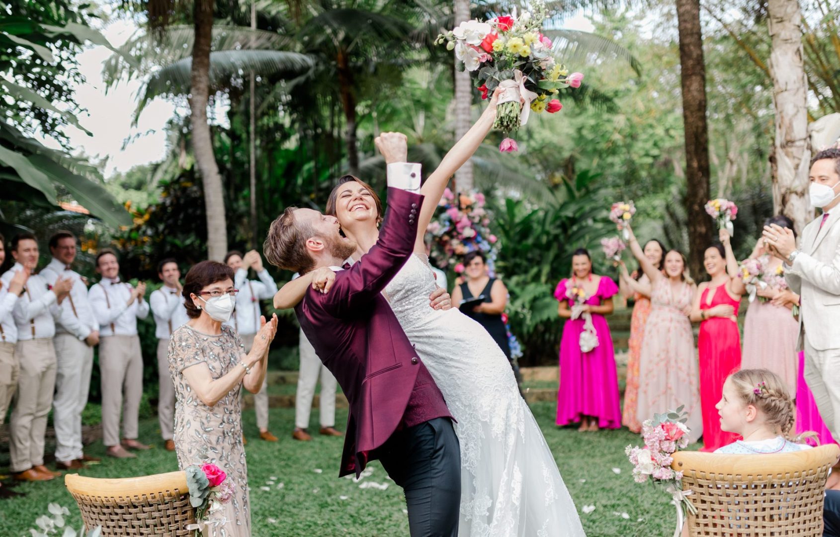 The bride and groom exchanged words, had their ribbon placed, exchanged rings, said “Yes, I do” and sealed their love with a kiss. As they made their exit, Julius carried the bride and all present celebrated their union with applause, shouts and laughter.