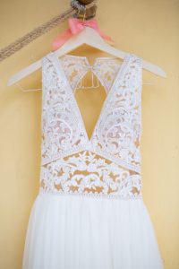 Andrea spent a relaxing moment with her closest family members, she looked beautiful in her white dress and resembled a sunset with her perfection. She opted for soft makeup and loose hair while Ben chose a gray suit, with a pink tie that matched Andrea’s bouquet perfectly.