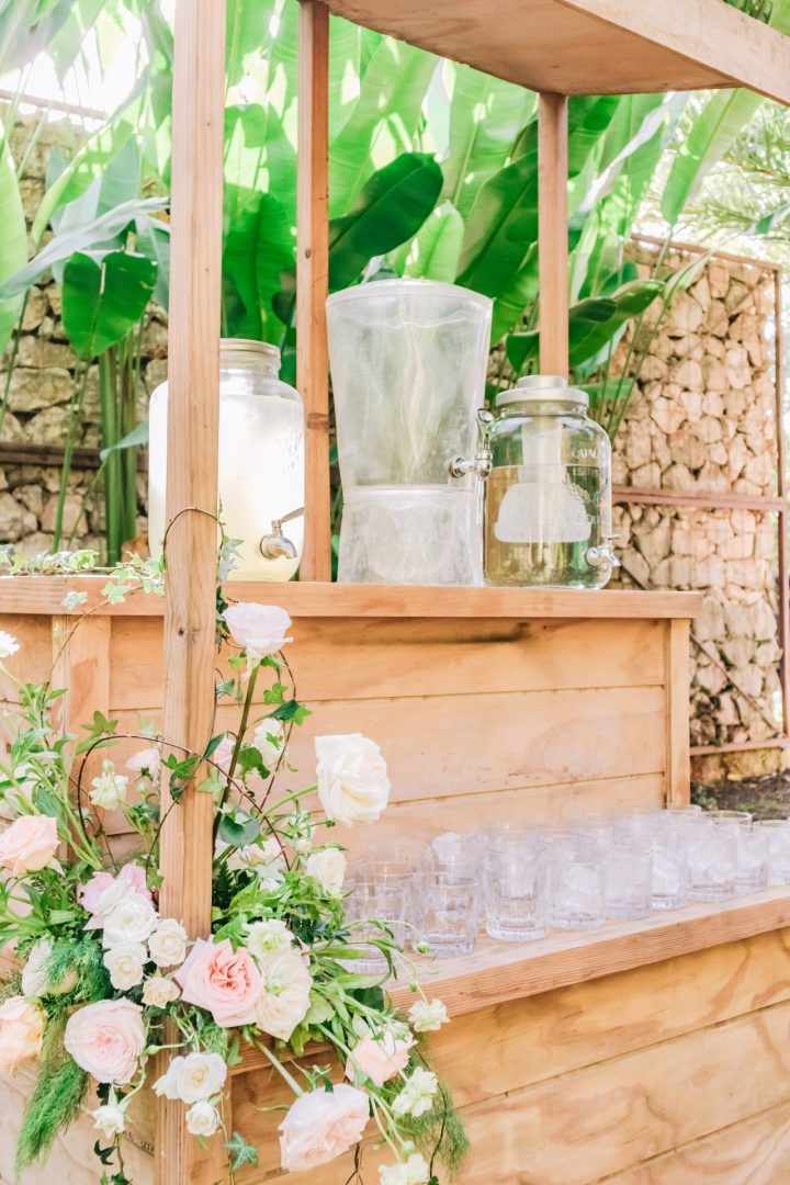 The recognized arch of the Hacienda was the spot for the ceremony, decorated with an embroidered curtain and accompanied by a green armchair, where the bride and groom were seated. On wooden tables were placed the appetizers that would be used, among dried fruit and tea utensils. In addition to delicate flowers to accompany.